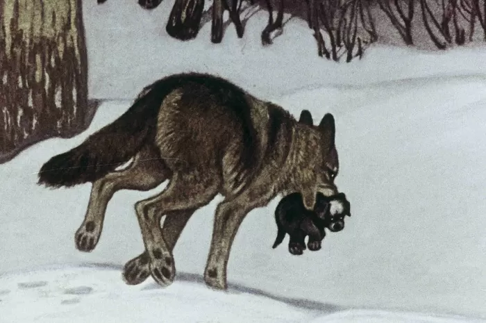 Волчица ищет, чем накормить своих волчат. Когда-то в молодости у нее было так много энергии и сил! А сейчас простая охота дается с большим трудом. Чтобы отвлечь волчат от голода, она играет с ними. А с наступлением темноты идет в село. Почувствовав нужный аромат в хлеву, она роется в сене и находит в нем ягненка. Берет его в рот и быстро убегает. Но добыча какая-то слишком мягкая, поэтому волчица отпускает животное и видит, что это щенок. Собачонок начинает лаять, и волчица уносит его в свое логово. Она решила сохранить ему жизнь. Тем более что он добрый и ласковый, играет с ее детенышами. Проходит время, и щенок самостоятельно убегает домой. Там он получает выговор от хозяина. Но зато про волчицу никто не узнал, иначе бы ее застрелили.