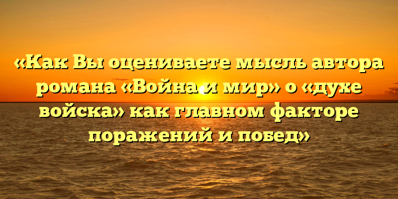 Меня зовут Вася, и я учусь в школе. Сочинение на тему «Как Вы оцениваете мысль автора романа «Война и мир» о «духе войска» как главном факторе поражений и побед» — это сложно, но я постараюсь. В романе «Война и мир» автор Лев Толстой говорит о том, что «дух войска» — это очень важно для победы или поражения в войне. Я считаю, что он прав, и могу привести пример из другого произведения русской литературы, чтобы это объяснить.